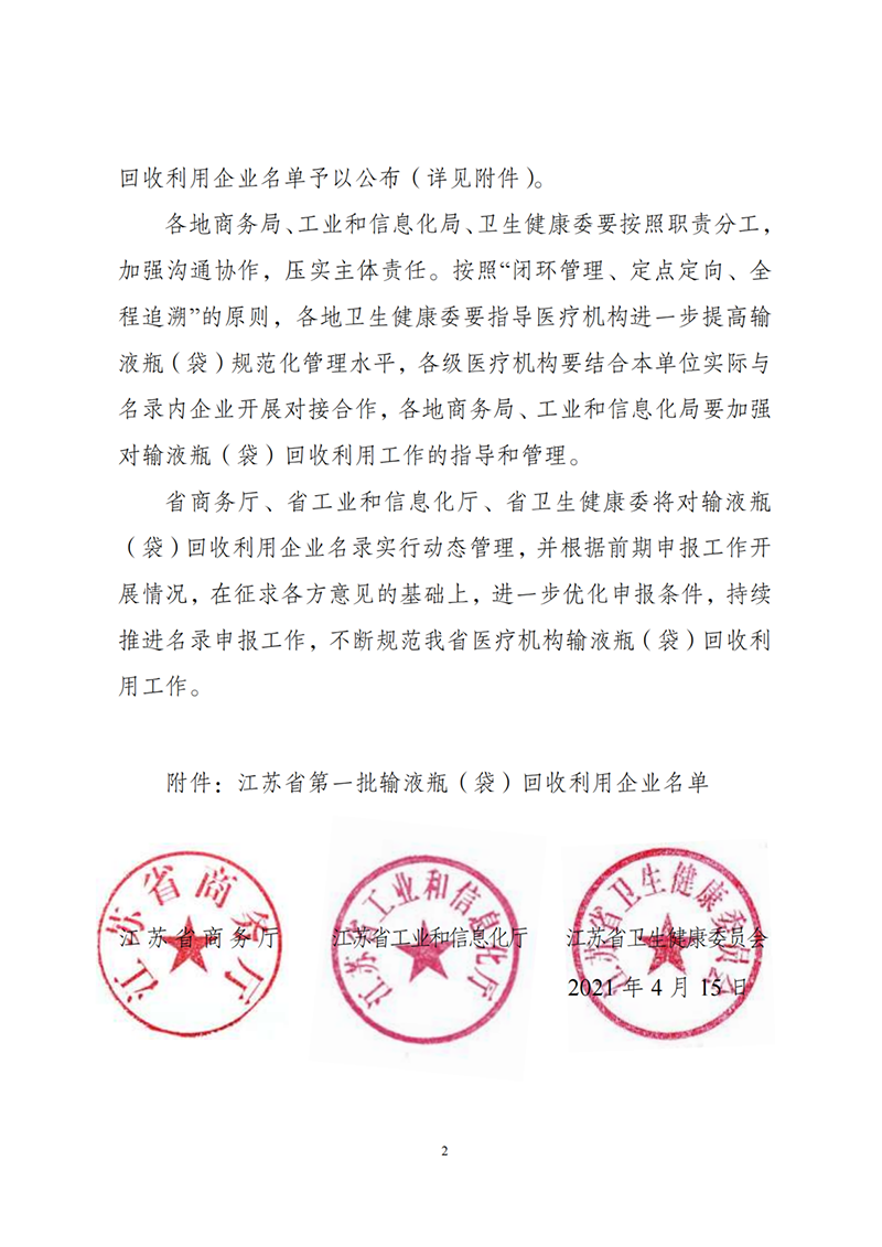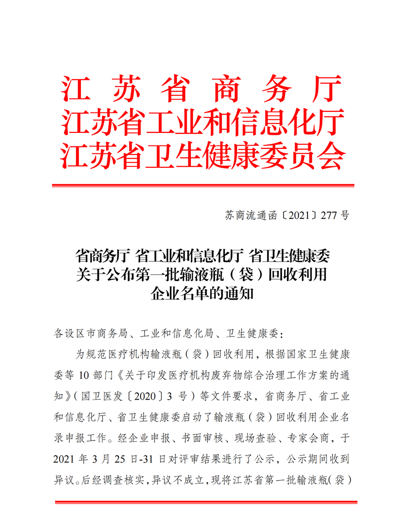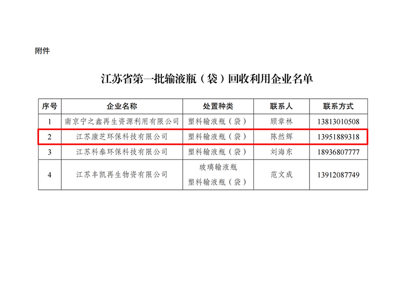 我公司子公司江蘇康芝環保科技有限公司已按照有關規定合法取得不屬醫療廢物的輸液瓶(袋)集中回收處置資質,回收處置院方醫療活動中產生的不屬醫療廢物的未被污染的一次性塑料輸液瓶(袋)、玻璃輸液瓶。